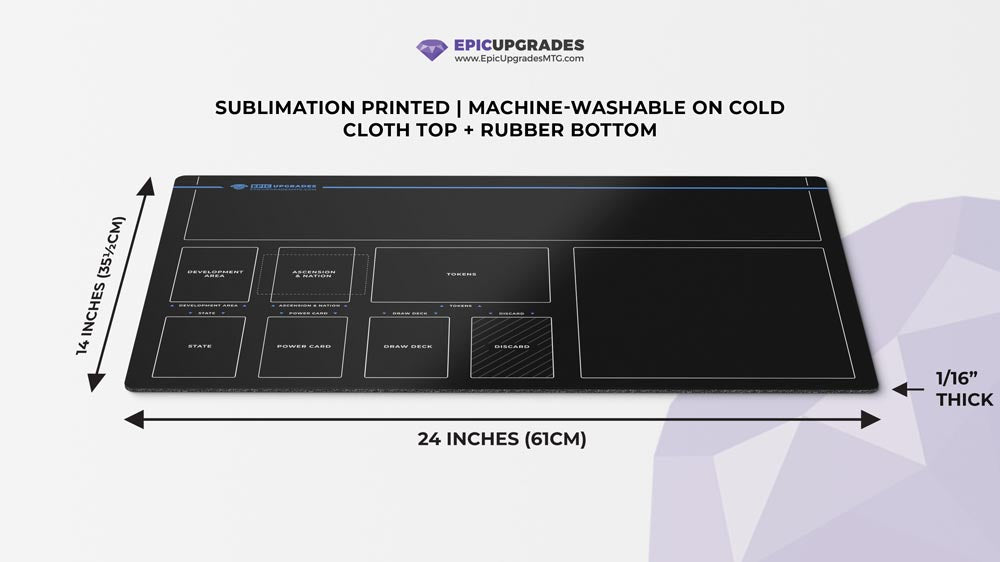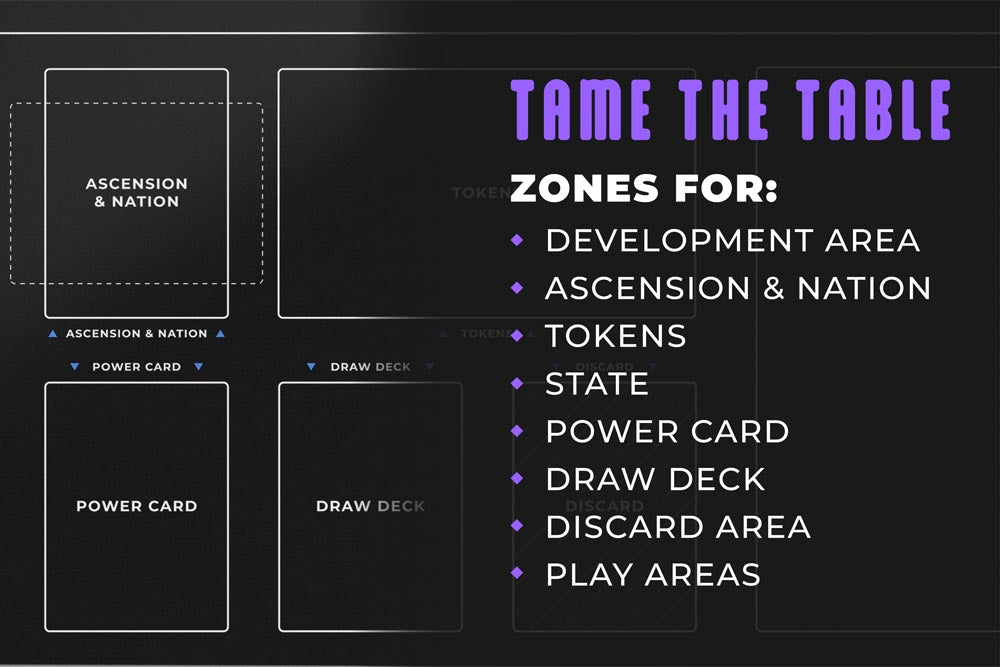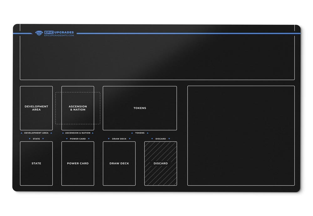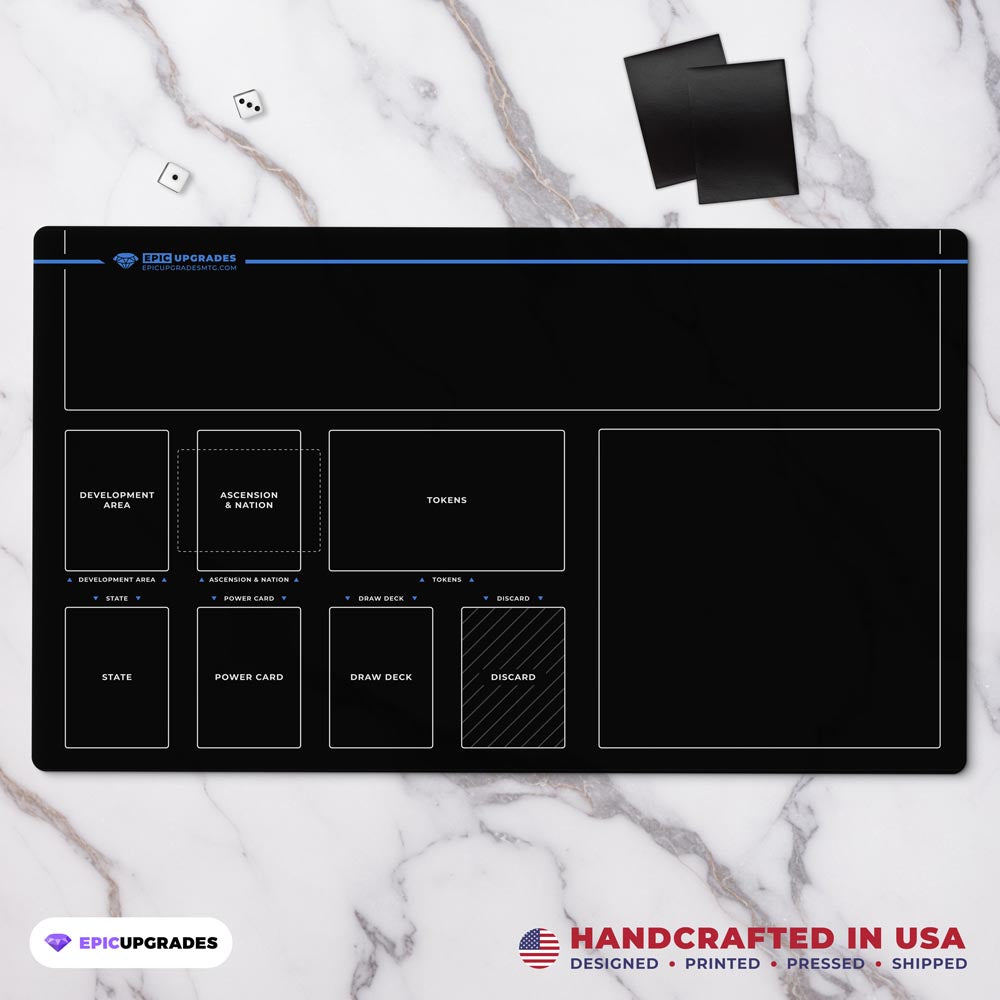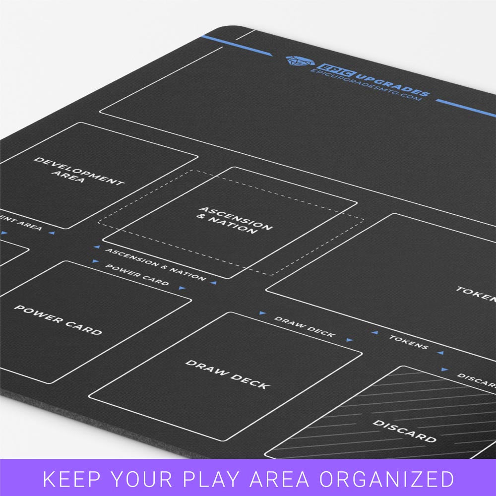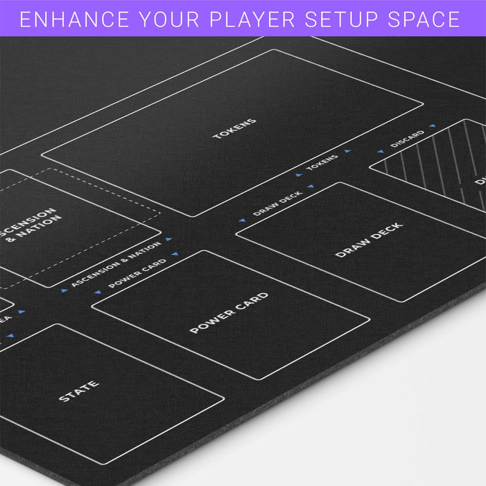 ✅ Dedicated Zones: Marked spaces for the player zones, including development area, ascension/nation, tokens, state, power card, draw deck, discard area, and more. These zones ensure efficient multiplayer play, allowing you to focus on strategy instead of shuffling through scattered components.